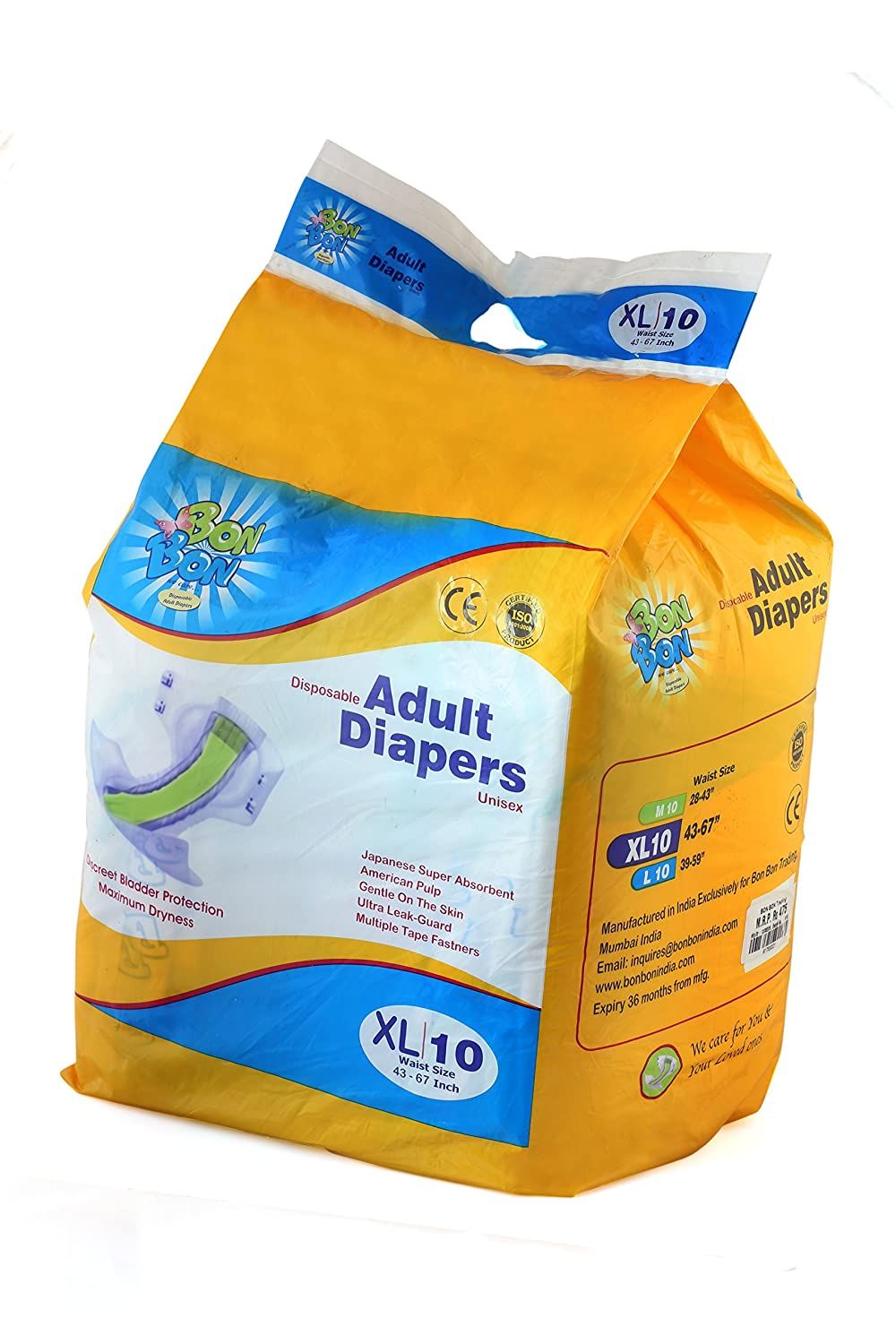 Bonbon Adult Diaper is a tape styled adult diaper Made in India to suit Indian needs. The Adult Diaper features single way non woven top that allows only single way passage of fluid into the absorbent layer and never back. The super absorbent polymer quickly turns the fluid into gel making the user feel dry and comfortable. Special soft leak guards prevent any chance of leakage. The adult diaper comes with absorption and distribution layer for best possible controlled absorption. With additional feature of multi strand leg which provides a snug fit without pinching he skin and prevents any leakage in the crotch layer. The high quality tape on the adult diaper provide for repeated adjustments of tape application.