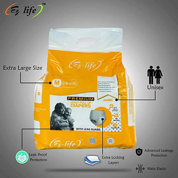 Ezlife Adult pull up diapers provide a Fully breathable Air Plus performance. The Super soft non-woven material ensures optimum comfort and the feeling of wearing. A normal underwear. High number of elastic threads for a firm, flexible fit. Unique Top Dry system, provides a dry surface and rapid absorption of urine keeping skin dry and less irritable. The fit is Secure with high barriers and latex free elastication.An efficient Odour system reduces the risk of unpleasant odour.The product is Dermatologically tested.